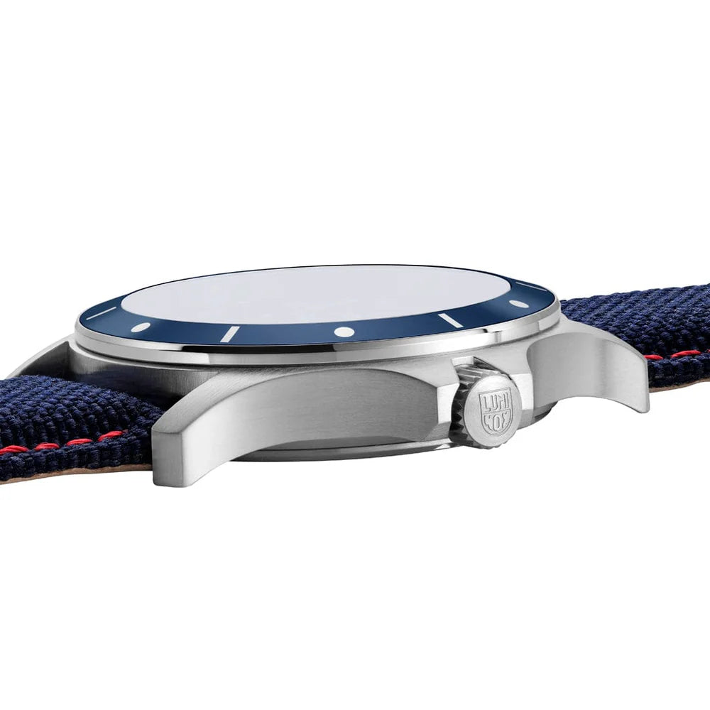 Featuring a deep blue sunray dial and a navy textile strap with red stitching, the Blue Valor strikes the perfect balance of style and strength. Its polished 316L stainless steel case adds refined elegance, while Luminox Light Technology (LLT) ensures visibility in complete darkness—glowing continuously for up to 25 years.